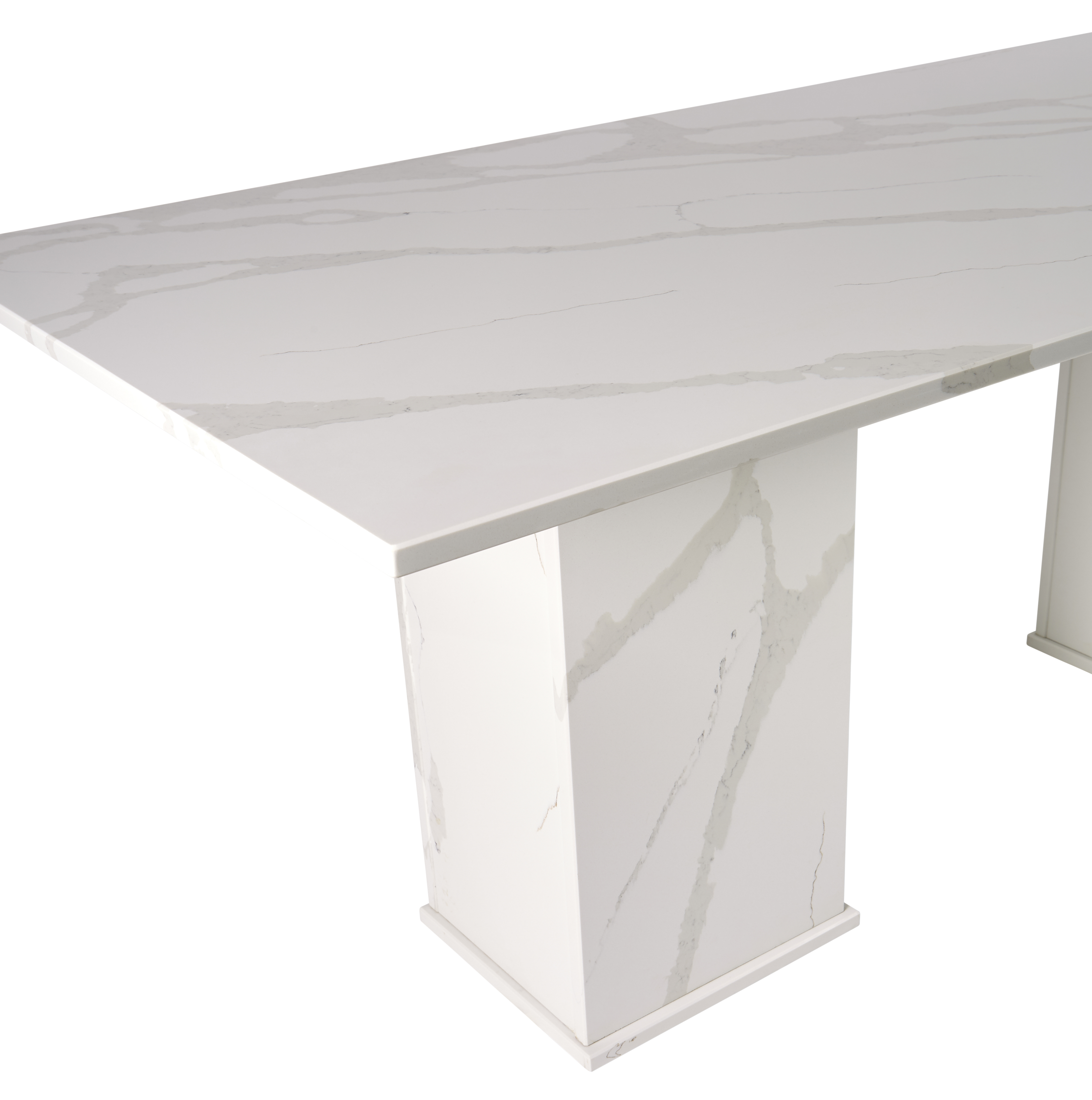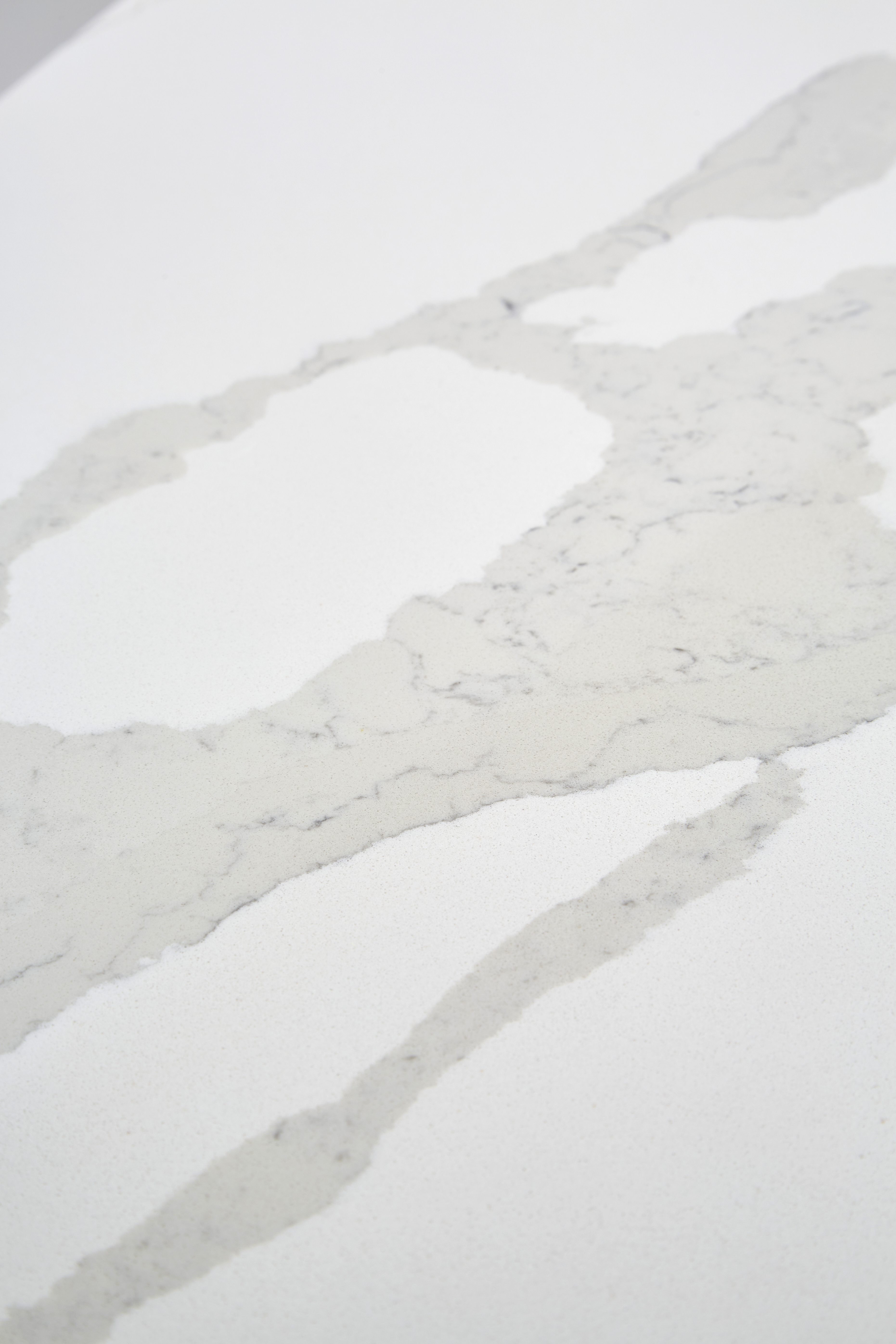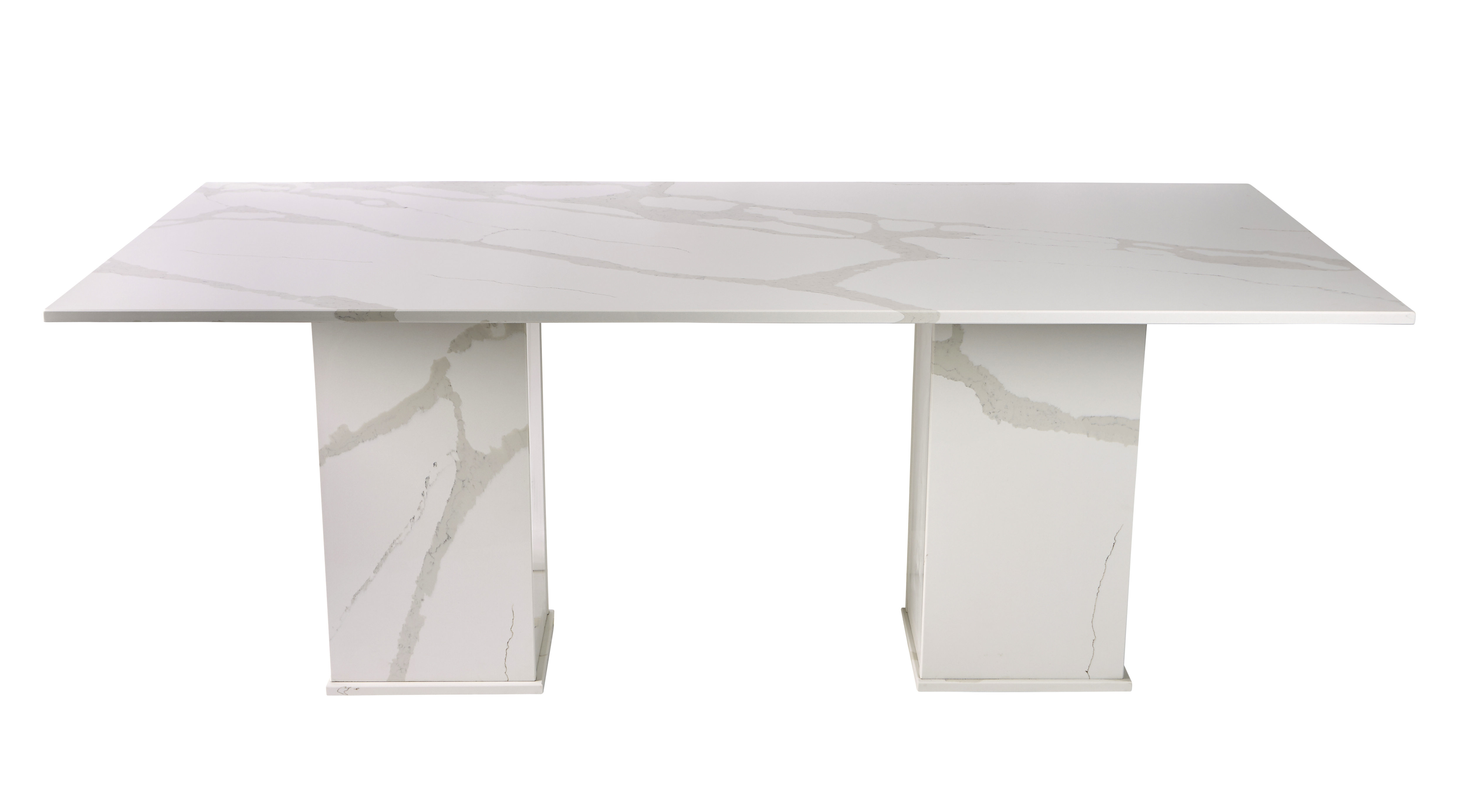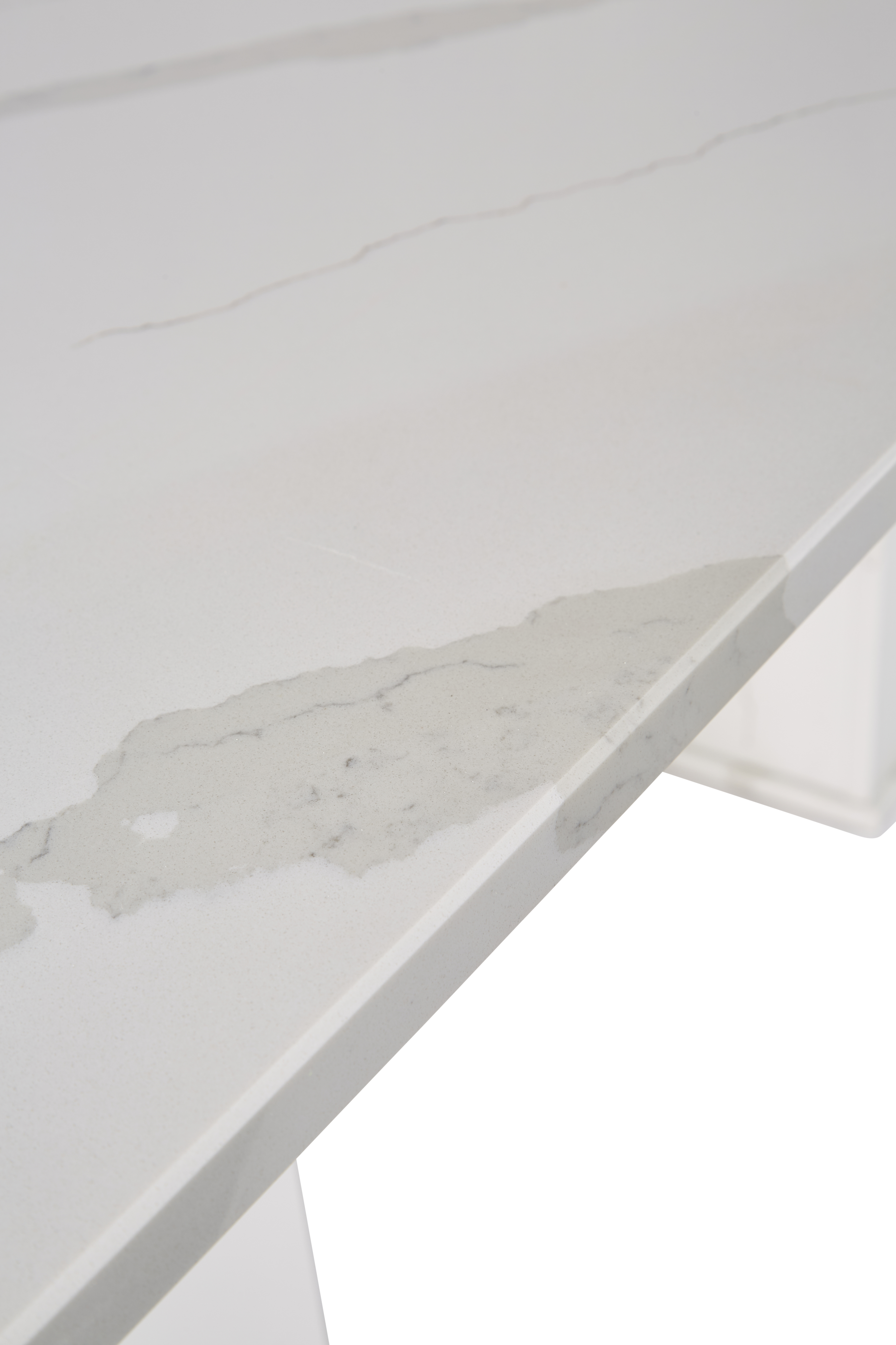 The White Calacatta quartz dining table is a stunning addition to any home, with splashes of bold, silver veins that spread across the quartz to create a truly spectacular effect.